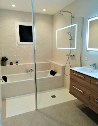 Nous réalisons également la rénovation complète de salle de bains, du plan initial à la pose finale. Douche italienne, baignoire, vasque, mobilier : chaque élément est installé avec soin pour allier confort, esthétique et fonctionnalité.